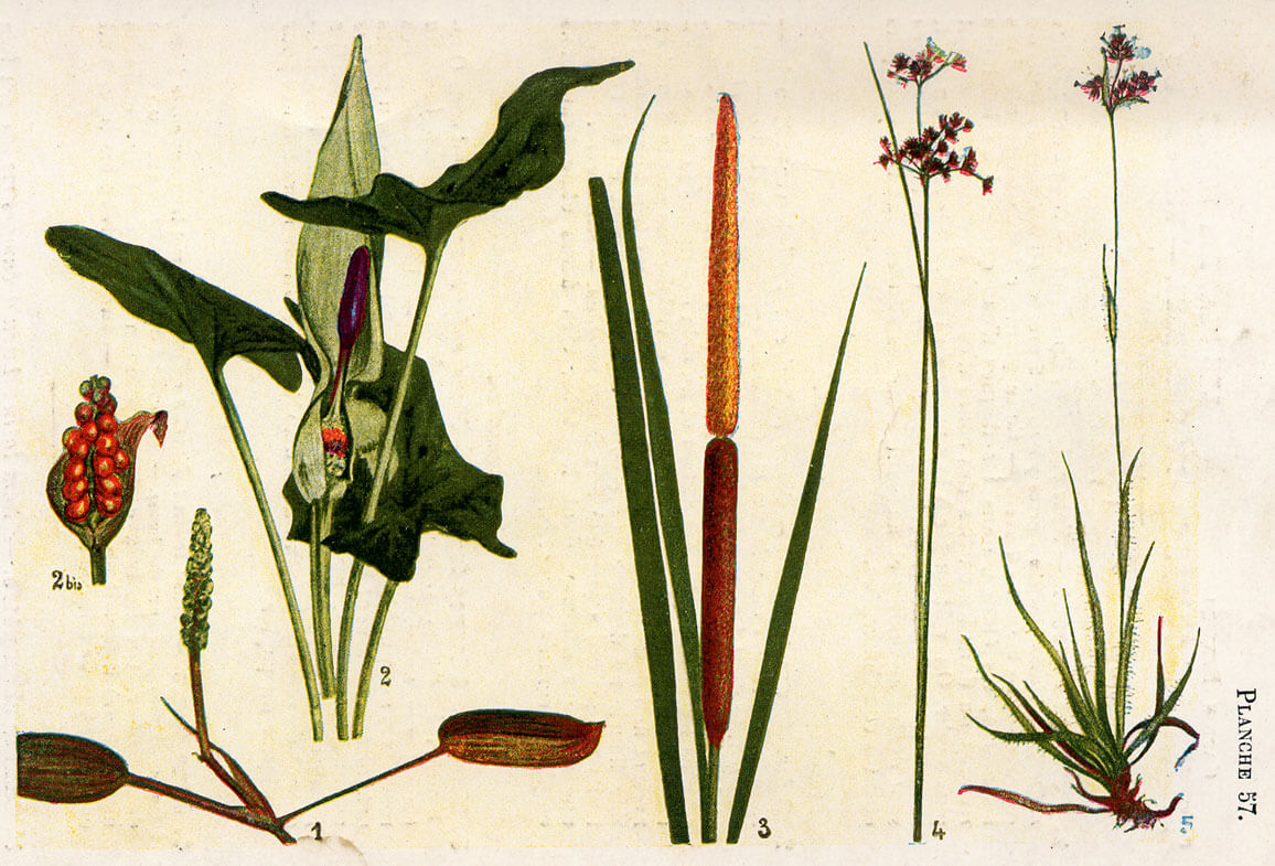 1. Potamot nageant (épi-d'eau) [Potamogeton natans].2, 2bis. Arum tacheté( Pied de veau , Gouet) [Arum maculatum].- médicinale.2, feuilles et fleurs;2 bis, fruits.3. Massette à larges feuilles(Masse d'eau, Quenouille, Massette, Canne de jonc). [Typha latifolia]4. Jonc épars[Juncus effusus] - industriel.5. Luzule champêtre - [Luzula campestris].